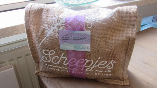 een label, een haaknaald nr 4, een soort sjaal pin (hun noemen het een breiwerksluiting ofzo :P ) en een kleur vanger